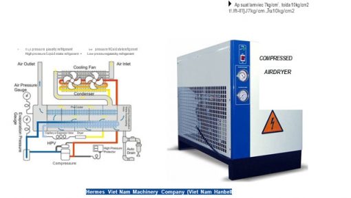Trong trường hợp sấy bằng làm lạnh, máy sấy cũng có thể bao gồm các thành phần như máy nén lạnh, làm mát, giúp làm lạnh không khí để nước có thể condense, được loại bỏ.